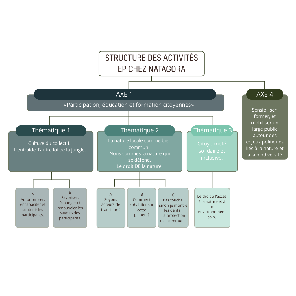 L'Éducation permanente (EP pour les intimes) est découpée en 4 “axes”, qui définissent des catégories d’actions différentes. Natagora est reconnue dans 2 axes :