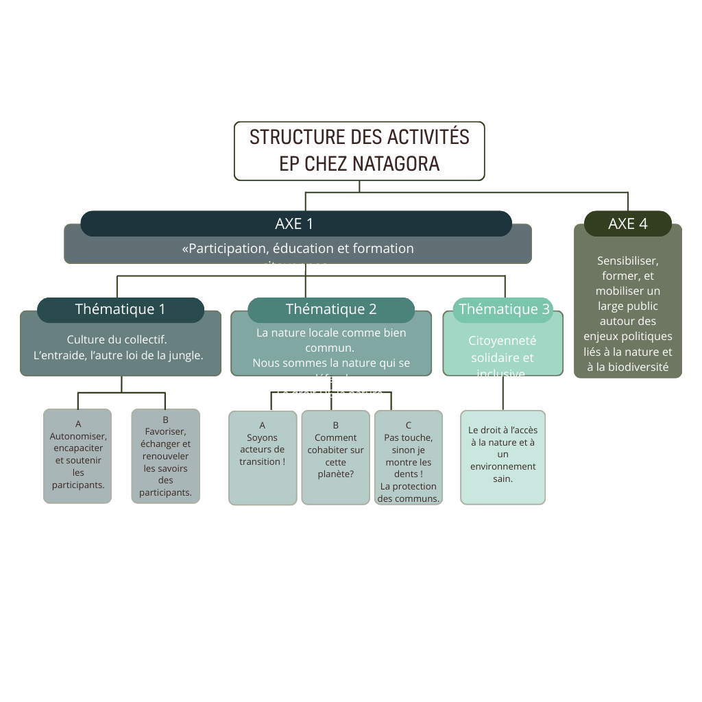 L'Éducation permanente (EP pour les intimes) est découpée en 4 “axes”, qui définissent des catégories d’actions différentes. Natagora est reconnue dans 2 axes :